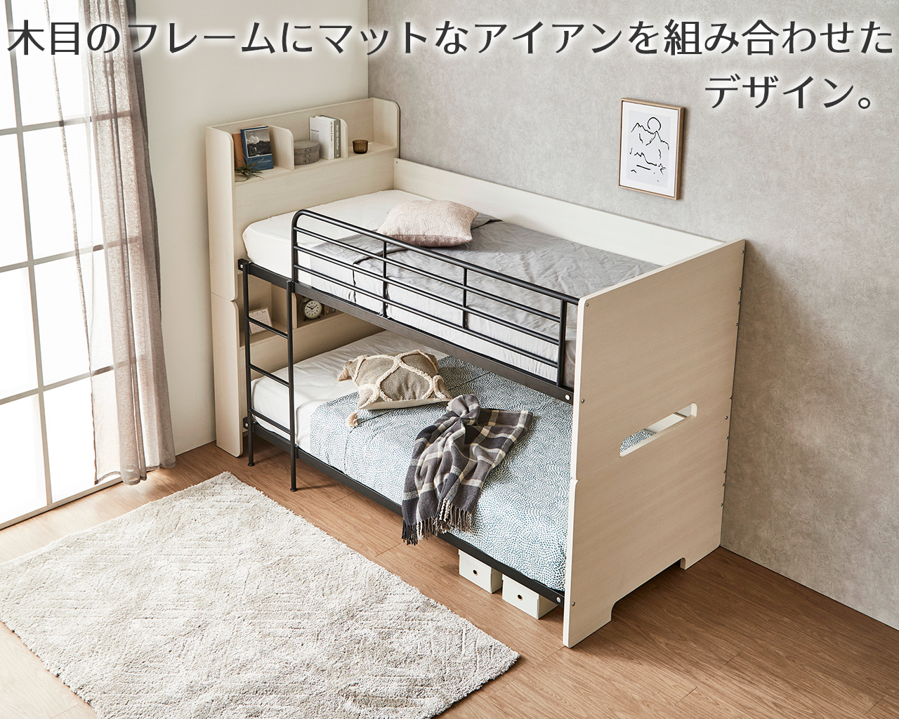 木目とマットなアイアンを組み合わせたスタイリッシュでモダンなデザイン。